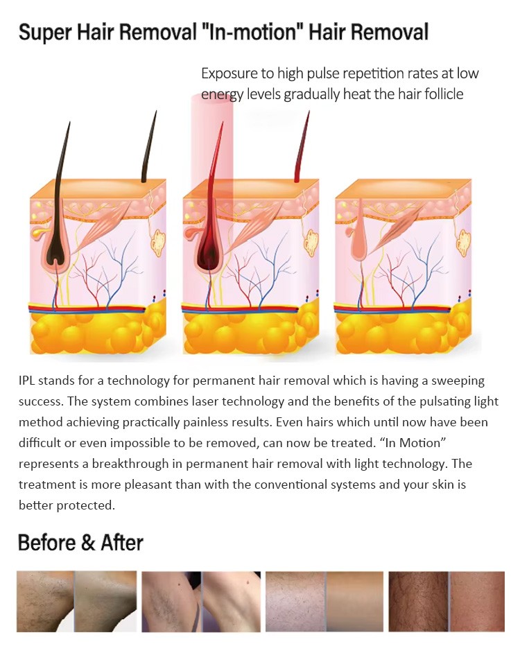 pressotherapy,IPL, E-Light, Diode Laser, ND YAG Laser,Vacuum Cavitation RF and Derma Roller etc.The main market includes Europe( with CE,ROHS),North America and Latin -America.